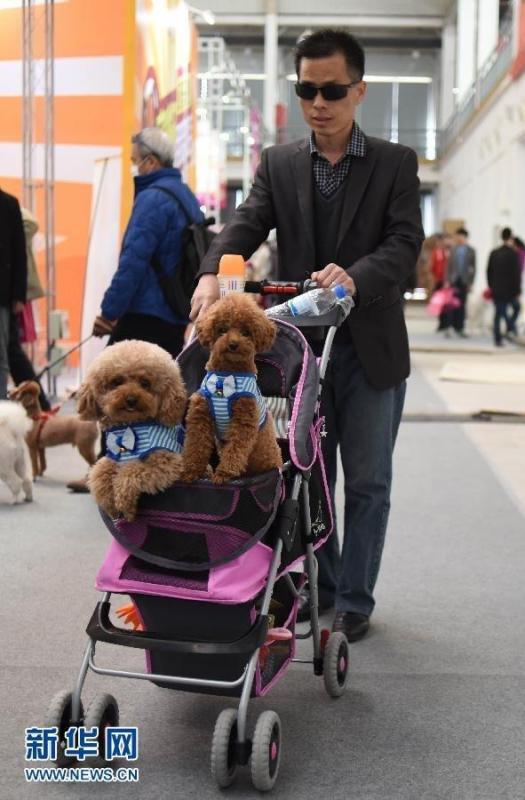 A photo shows two teddy dogs sitting in a buggy. The 2015 China Pet Festival started on April 11 and will last for three days. (Photo/Xinhua)