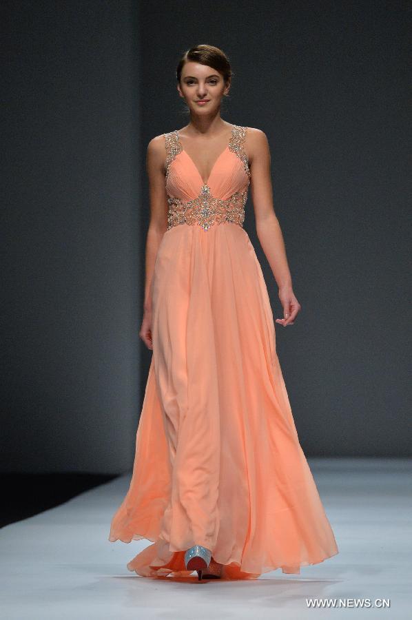 A model presents a creation of Mon Cheri during the 2015 Shanghai Fashion Week Autumn/Winter in east China's Shanghai, April 12, 2015. (Xinhua/Guo Changyao)