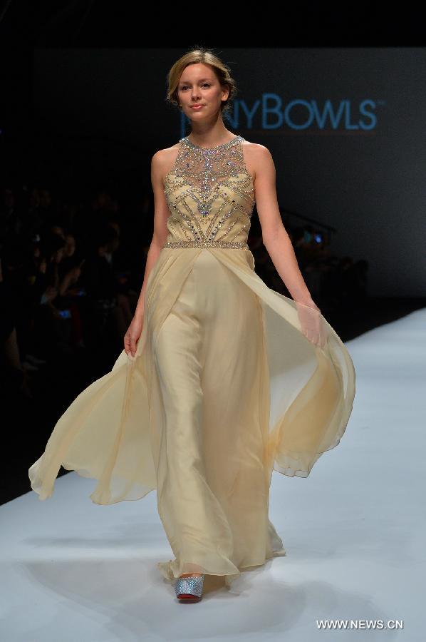 A model presents a creation of Mon Cheri during the 2015 Shanghai Fashion Week Autumn/Winter in east China's Shanghai, April 12, 2015. (Xinhua/Guo Changyao)