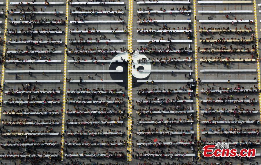 A total of 17,000 people simultaneously make dumplings while watching a cooking class video in 18 places in North China’s Henan province, April 12, 2015. With 4613 participants passing the challenge in the 50-minute long class, it set a Guinness World Record for the largest cooking class. The previous record involved 3,687 people making dumplings in Qingdao, Shandong province, February 14, 2015. (Photo: China News Service/Wang Zhongju)