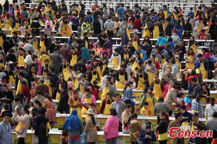 A total of 17,000 people simultaneously make dumplings while watching a cooking class video in 18 places in North China’s Henan province, April 12, 2015. With 4613 participants passing the challenge in the 50-minute long class, it set a Guinness World Record for the largest cooking class. The previous record involved 3,687 people making dumplings in Qingdao, Shandong province, February 14, 2015. (Photo: China News Service/Wang Zhongju)