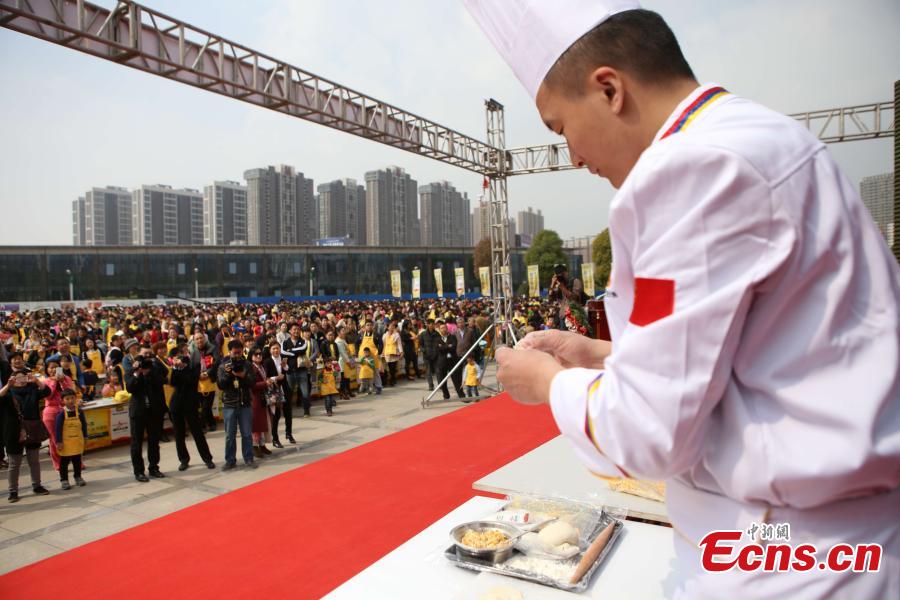 A total of 17,000 people simultaneously make dumplings while watching a cooking class video in 18 places in North China’s Henan province, April 12, 2015. With 4613 participants passing the challenge in the 50-minute long class, it set a Guinness World Record for the largest cooking class. The previous record involved 3,687 people making dumplings in Qingdao, Shandong province, February 14, 2015. (Photo: China News Service/Wang Zhongju)