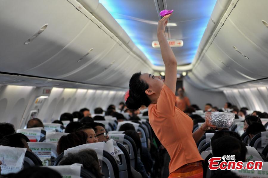 A flight attendant, donned in ethnic Dai traditional costume, splashes water on passengers on a flight from Taiyuan to Kunming, Southwest China's Yunnan province, April 13, 2015. The annual water-sprinkling festival kicked off on Sunday. (Photo: China News Service/Ren Dong)