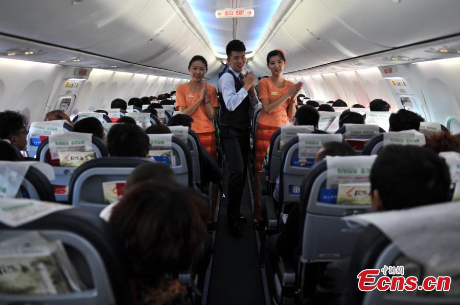 Flight attendants, donned in ethnic Dai traditional costume, splash water on passengers on a flight from Taiyuan to Kunming, Southwest China's Yunnan province, April 13, 2015. The annual water-sprinkling festival kicked off on Sunday. (Photo: China News Service/Ren Dong)