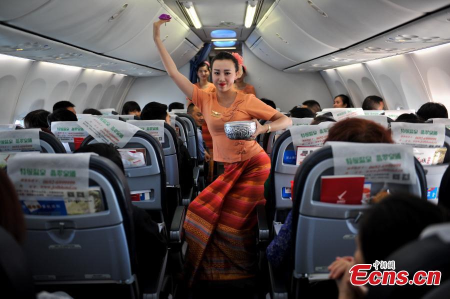 A flight attendant, donned in ethnic Dai traditional costume, splashes water on passengers on a flight from Taiyuan to Kunming, Southwest China's Yunnan province, April 13, 2015. The annual water-sprinkling festival kicked off on Sunday. (Photo: China News Service/Ren Dong)