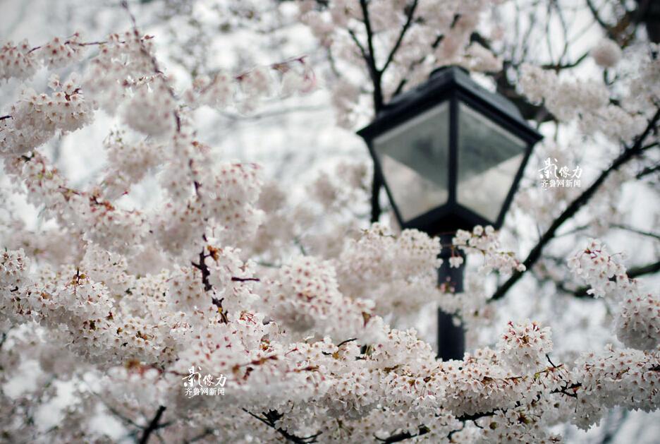 | On April 13, people watch the beautiful cherry blossoms at Zhongshan Park in Qingdao City, Shandong province. In the 660-meter-long Cherry Blossom Street, they enjoyed the peak bloom and took photos of the amazing scenery in the moist airafter the rain. (Photo source: iqilu.com) |