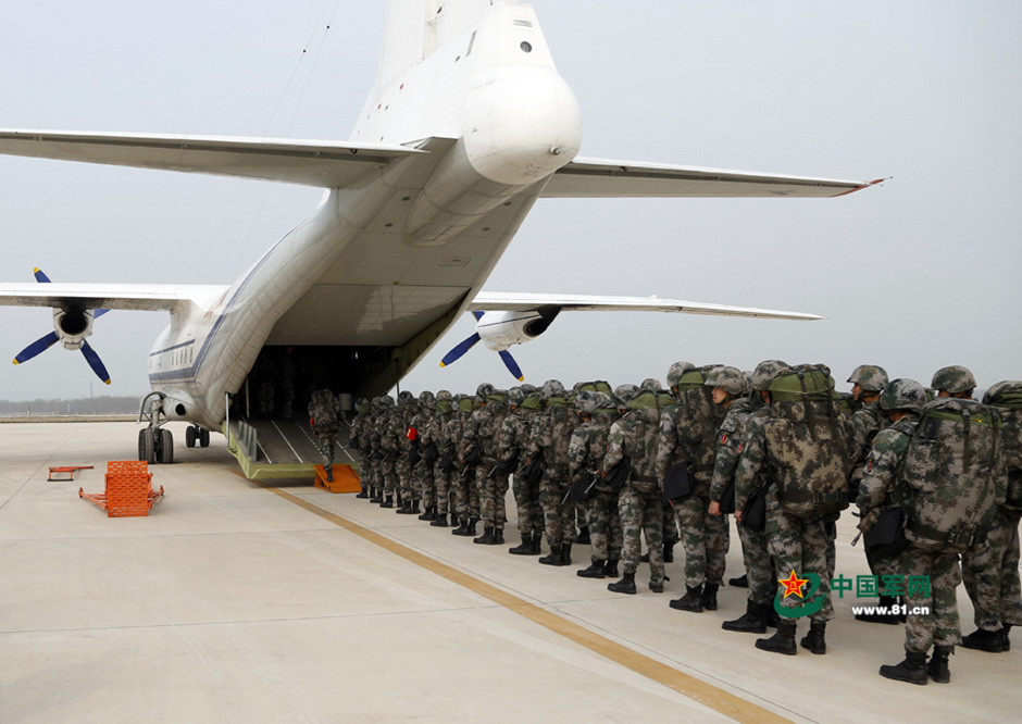 To improve the quick reaction capability, a special operations brigade of Jinan Military Region and an air force unit jointly conduct air transportation training on April 8, 2015.(Photo source: www.81.cn)