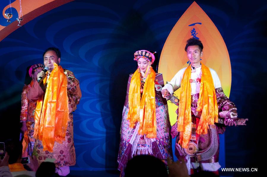 Dawa Zhoema (2nd, L) and Phuntsok (L) were annouced to be wife and husband by an elder in Dianba County, southwest China's Sichuan Province, April 11, 2015. Dawa Zhoema and her husband Phuntsok, both Tibetans born in the 1980s, held their wedding ceremony in a traditional way last Saturday. The wedding ceremony attracted a lot of attention as some of their fashionable pictures were largely liked and shared on various social networks in China recently. (Xinhua/Wang Di)