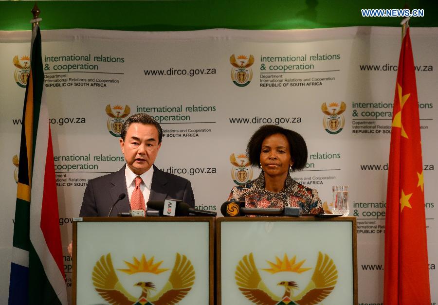 Visiting Chinese Foreign Minister Wang Yi (L) and Maite Nkoana-Mashabane, Minister of the Department of International Relations and Cooperation of South Africa, attend a press conference following their meeting in Pretoria, South Africa, on April 14, 2015. (Xinhua/Zhai Jianlan)