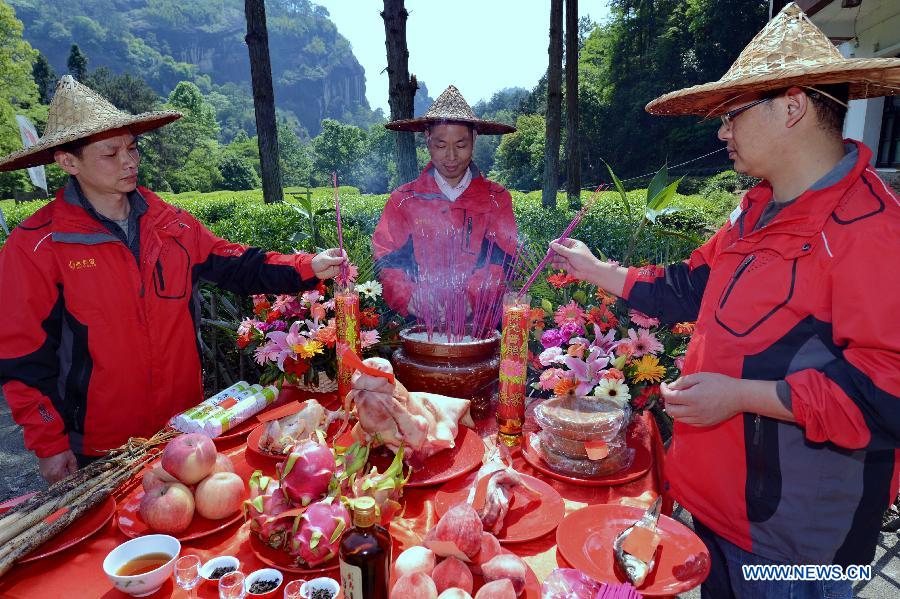 Tea growers attend a ceremony praying for harvest of tea in Wuyishan City, southeast China's Fujian Province, April 16, 2015. (Xinhua/Zhang Guojun)