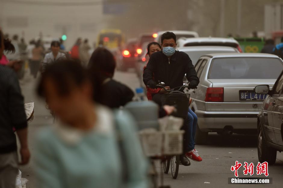 People ride in a sandstorm in Beijing, China, on April 15, 2015. Beijing was hit by moderate gale from Wednesday evening to night, and Beijing Meteorological Observatory has issued a yellow alert for sandstorm on Wednesday afternoon. (Photo/CNS)