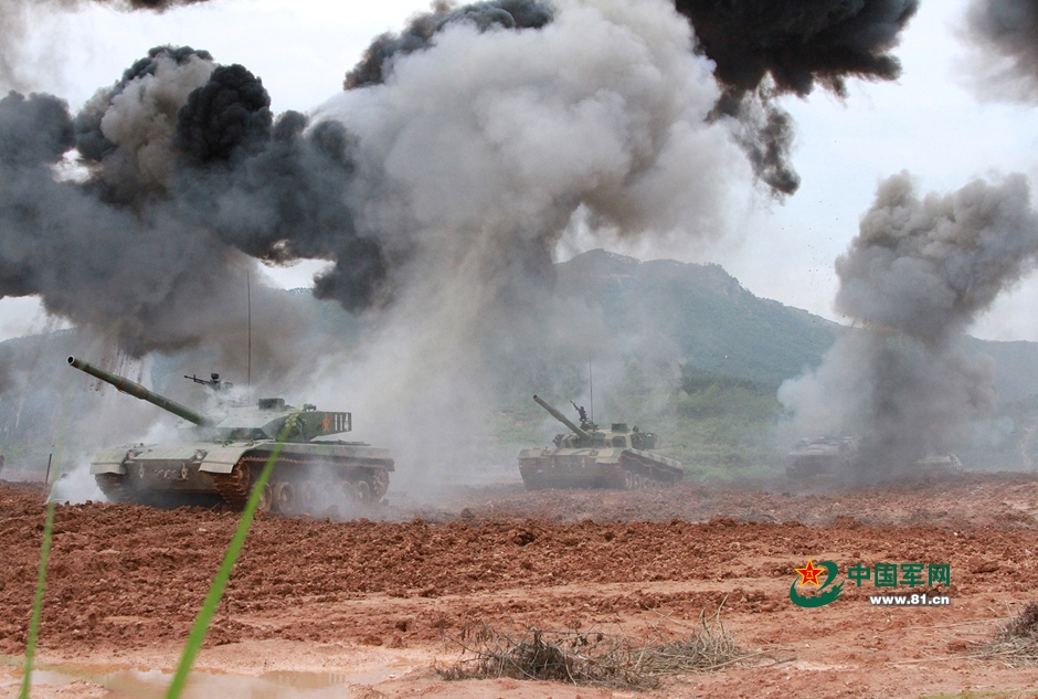 The Type 96A tanks get through the gunfire blockade zone of the "enemy" and move forward. On April 12, 2015, an armored regiment under the Nanjing Military Region of the People's Liberation Army (PLA) held training under the combat environment to temper soldiers’ combat skills and fighting spirit as well as to improve the emergency response ability. (Photo source: 81.cn)