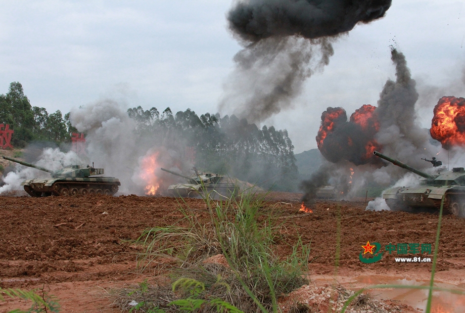 The Type 96A tanks get through the gunfire blockade zone of the "enemy" and move forward. On April 12, 2015, an armored regiment under the Nanjing Military Region of the People's Liberation Army (PLA) held training under the combat environment to temper soldiers’ combat skills and fighting spirit as well as to improve the emergency response ability. (Photo source: 81.cn)