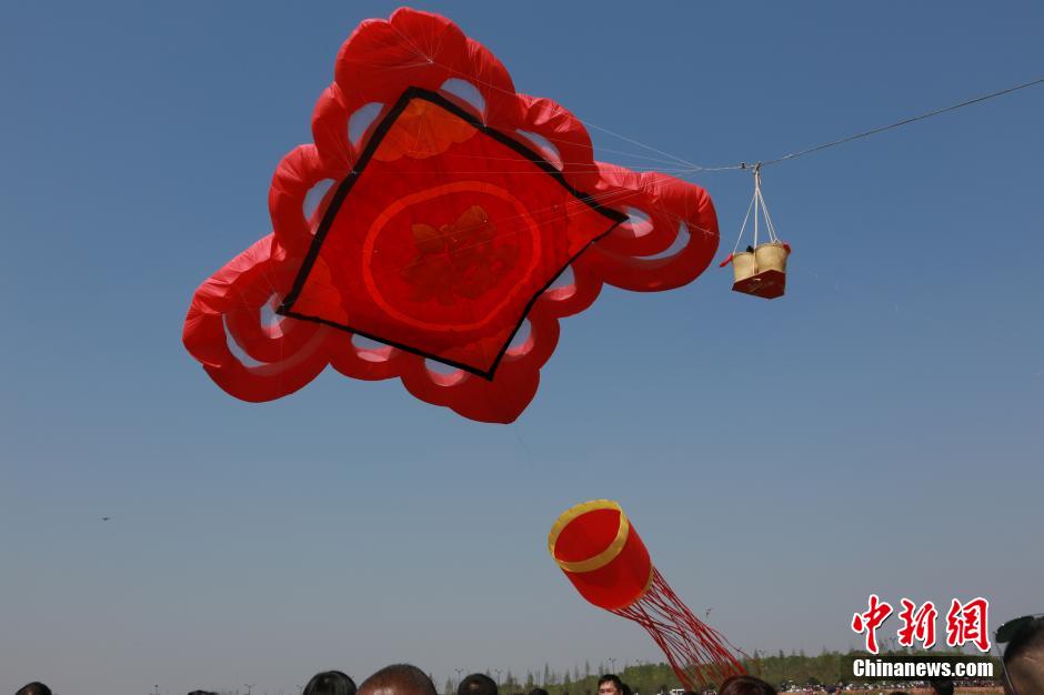 The huge Chinese-knot-shaped kite flies with three small sheep hanging on it in Changsha city, capital of Hunan province. (CNS/Zhuo Xinmin)