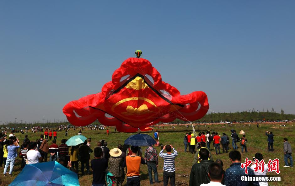 The huge Chinese-knot-shaped kite flies with three small sheep hanging on it in Changsha city, capital of Hunan province. (CNS/Zhuo Xinmin)