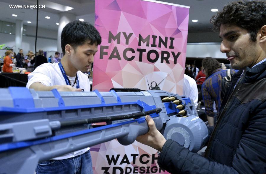 A visitor looks at a 3D printed simulated gun at the 3D Print Design Show in New York, the United States, April 16, 2015. The 3D Print Design Show is held on April 16 and 17 in New York. (Xinhua/Wang Lei)