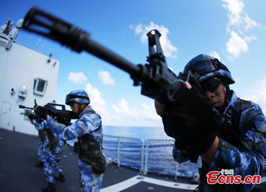 Soldiers of the 20th fleet from China's navy train while sailing to the Gulf of Aden and waters off Somali to escort civil ships, April 16, 2015. The fleet is comprised of the missile destroyer Jinan, missile frigate Yiyang and supply ship Qiandaohu. It is equipped with two helicopters and staffed by dozens of special operation soldiers and more than 800 officers and soldiers. (Photo: China News Service/Dai Zongfeng)