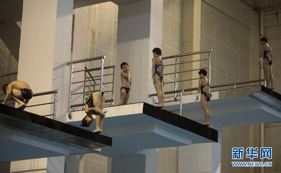 Little diving athletes are trained at the swimming center of Dongguan, Guangzhou, April 14, 2015. (Xinhuanew/Fei Maohua)