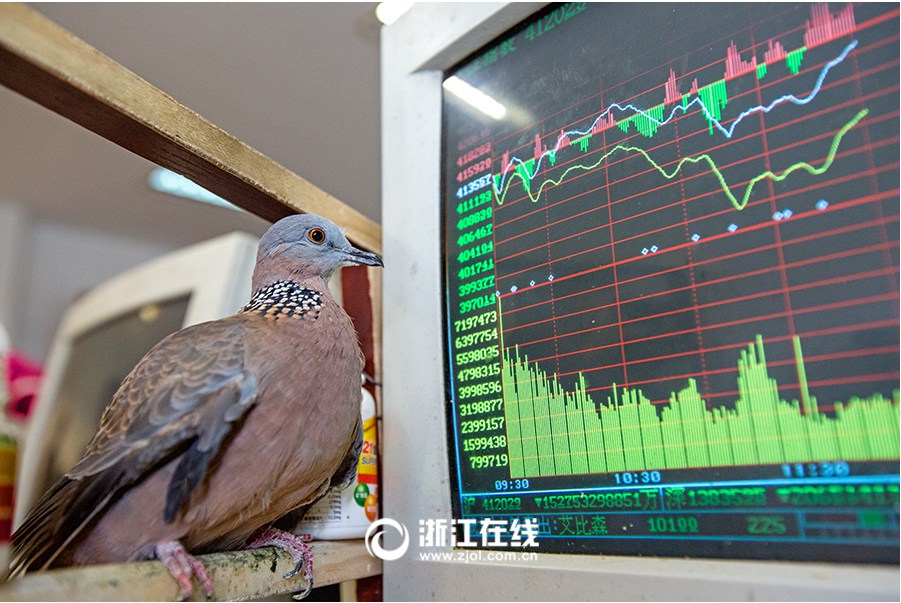 Really? A pigeon plays the stock market? Actually he accompanies his owner Shu when he looks at prices of shares. The pigeon named Huihui is a local star in Hangzhou: He can walk on stairs, look in mirrors, accompany Shu, and never flies away from him.