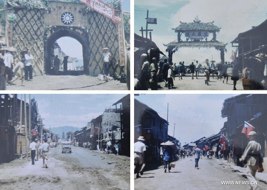 The copied file photos taken on August 21, 1945 by U.S. veteran Joe Day shows the scenes of celebrations upon Japan's surrender in Zhijiang County, central China's Hunan Province. A museum in Zhijiang Dong Autonomous County of Hunan Province debuted 32 color photos on April 17, 2015 that documented Japan's surrender in the province in August 1945. They were among 223 photos of the Chinese Anti-Japanese War donated last November by Joe Day, a member of the Flying Tigers, the 1st American Volunteer Group formed in 1941 to help China drive out invading Japanese troops. On August 21-23, 1945, Japanese representatives fled to Zhijiang, handed over a map of Japanese troops deployed in China and signed a surrender memorandum. (Xinhua/Ming Xing)
