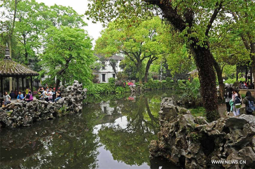 Tourists visit a classical Chinese garden at Jiayetang Library in Nanxun Town of Huzhou City, east China's Zhejiang Province, April 19, 2015. A total of 13 ancient towns in east China's Zhejiang and Jiangsu provinces have recently joined hands to apply for the list of world heritage. The application work is expected to complete before March 2017. (Xinhua/Tan Jin)
