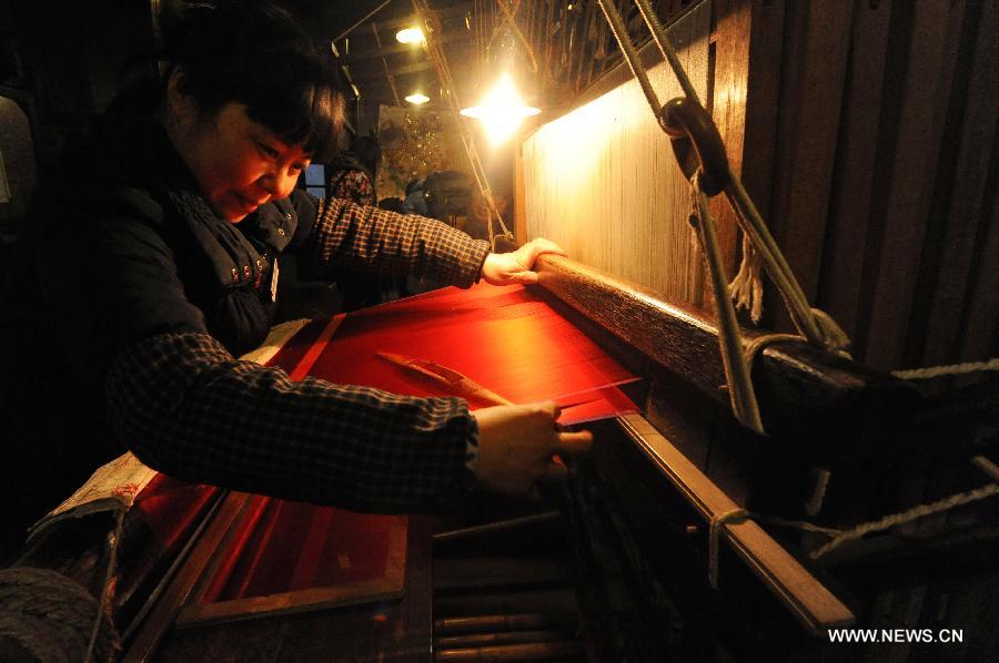 A woman weaves a brocade with silks and golden threads in Wuzhen Town of Jiaxing City, east China's Zhejiang Province, April 6, 2015. A total of 13 ancient towns in east China's Zhejiang and Jiangsu provinces have recently joined hands to apply for the list of world heritage. The application work is expected to complete before March 2017. (Xinhua/Tan Jin)