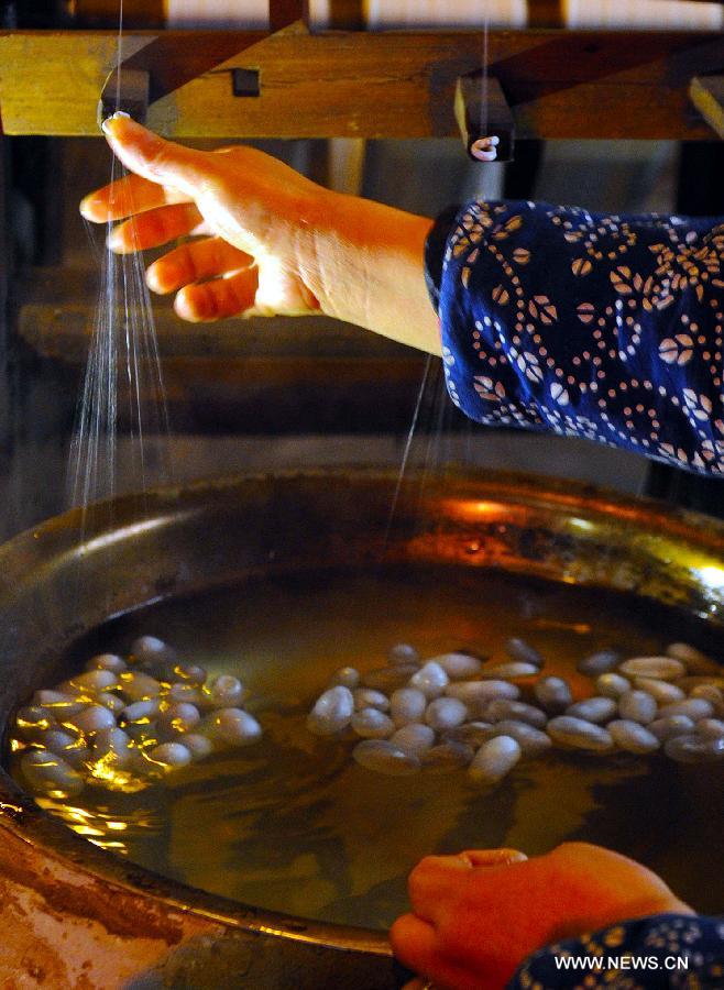 A woman reels off raw silk from coccons in Wuzhen Town of Jiaxing City, east China's Zhejiang Province, April 6, 2015. A total of 13 ancient towns in east China's Zhejiang and Jiangsu provinces have recently joined hands to apply for the list of world heritage. The application work is expected to complete before March 2017. (Xinhua/Tan Jin)