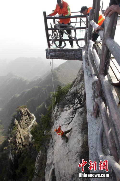 A cleaning worker collects garbage on precipice in wind in Laojunshan Mountain of Luoyang, central China’s Henan province on April 16, 2015. Having a rope tied on the waist, the worker climbed under a suspended plank road 2000 meters high, just like a Spider Man. (Chinanews/Wang Zhongju)