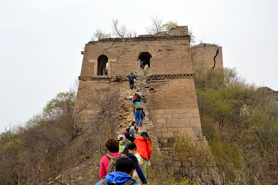 People take photos when they climb the Huanghuacheng Water Great Wall. (People's Daily Online/Wang Ao)