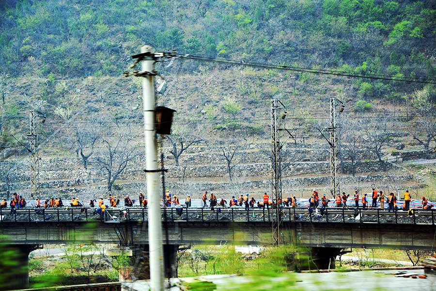 Workers repair the rails on the way to the Huanghuacheng Water Great Wall. (People's Daily Online/Wang Ao)