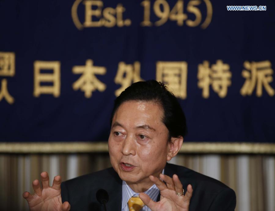 Former Japanese Prime Minister Yukio Hatoyama speaks during a press conference in Tokyo, Japan, April 22, 2015. Hatoyama called on Prime Minister Shinzo Abe to follow the Murayama Statement and to include the key words in his war anniversary statement, adding that he has "considerable anxieties" that Abe's statement may increase tensions among peoples of the Asian region. (Xinhua/Stringer)
