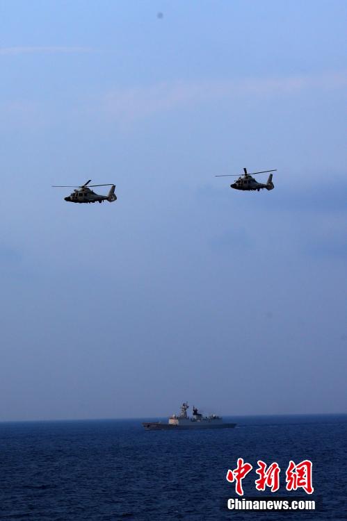 The 20th escort fleet of Chinese navy in the Gulf of Aden and waters off Somali conducted flight training for ship board helicopters on April 19, 2015. Two helicopters on missile destroyer Jinan and missile frigate Yiyang successfully finished this day and night training, with multiple training subjects completed. (Chinanews/Dai Zongfeng)
