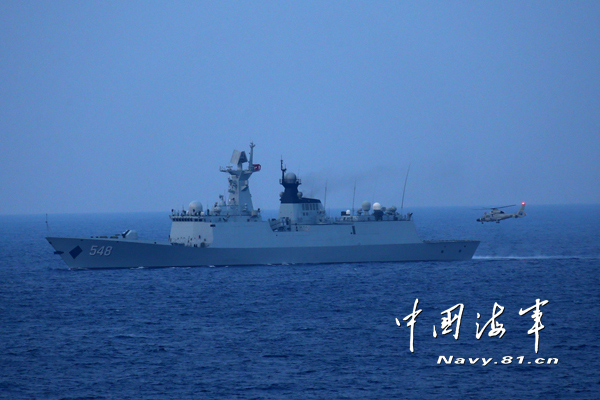 The 20th escort fleet of Chinese navy in the Gulf of Aden and waters off Somali conducted flight training for ship board helicopters on April 19, 2015. Two helicopters on missile destroyer Jinan and missile frigate Yiyang successfully finished this day and night training, with multiple training subjects completed. (Photo source: navy.81.cn)