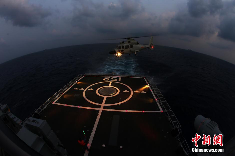 The 20th escort fleet of Chinese navy in the Gulf of Aden and waters off Somali conducted flight training for ship board helicopters on April 19, 2015. Two helicopters on missile destroyer Jinan and missile frigate Yiyang successfully finished this day and night training, with multiple training subjects completed. (Chinanews/Dai Zongfeng)