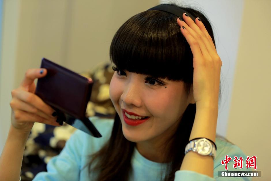 Chen has to make a variety of poses at the request of the crowds who want to have their photo taken with her. Moreover, she has to wear sweet smile all through the day. She politely declines requests from people who make her speechless.(Chinanews.com/Liang Ben)