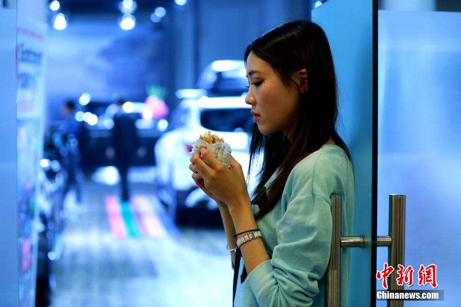 During her break, Chen grabs a bite to eat before continuing her work. After spending two days working as a model at the auto show, her legs are swollen; her feet are sore, and her face is numb from smiling all day.(Chinanews.com/Liang Ben)
