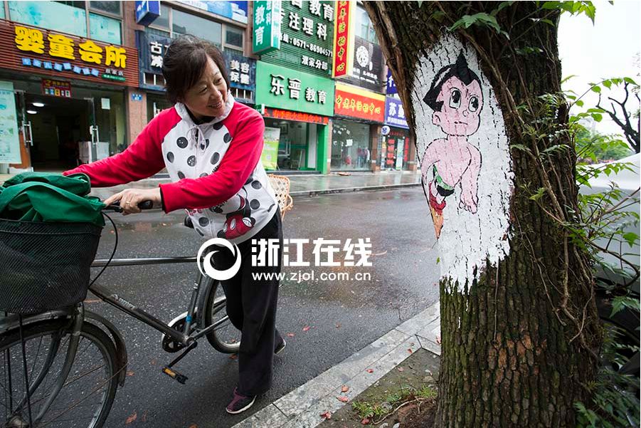 On the Tianyun Road of Hangzhou, cartoon characters are painted all over the trees on both sides of the road. Many people come and take pictures with these trees.