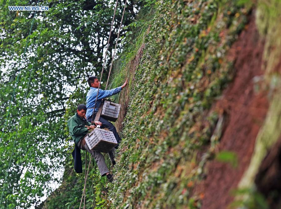 A farmer plants Dendrobium officinale Kimura et Migo, a kind of rare traditional Chinese medicine, in Wang'er Town of Qianshan County, east China's Jiangxi Province, April 22, 2015. Xu Nanjing and his friends, farmers of Wang'er Town, began to plant Dendrobium officinale Kimura et Migo since 2013. The output is estimated to reach about 300 kilograms next year and is expected to yield 1 million RMB yuan (161,300 U.S. dollars). (Xinhua/Ding Minghua)