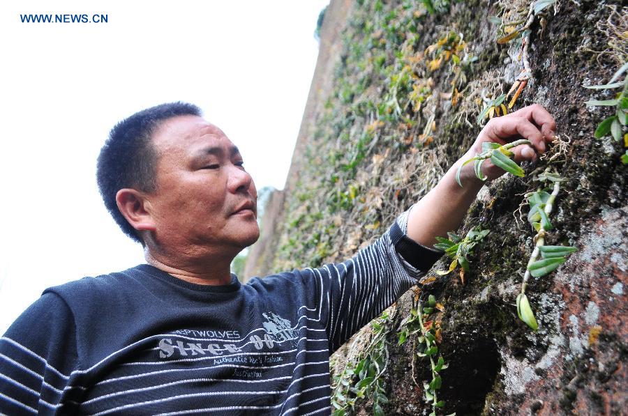 Xu Nanjing checks the growth of Dendrobium officinale Kimura et Migo, a kind of rare traditional Chinese medicine, in Wang'er Town of Qianshan County, east China's Jiangxi Province, April 22, 2015. Xu Nanjing and his friends, farmers of Wang'er Town, began to plant Dendrobium officinale Kimura et Migo since 2013. The output is estimated to reach about 300 kilograms next year and is expected to yield 1 million RMB yuan (161,300 U.S. dollars). (Xinhua/Ding Minghua)