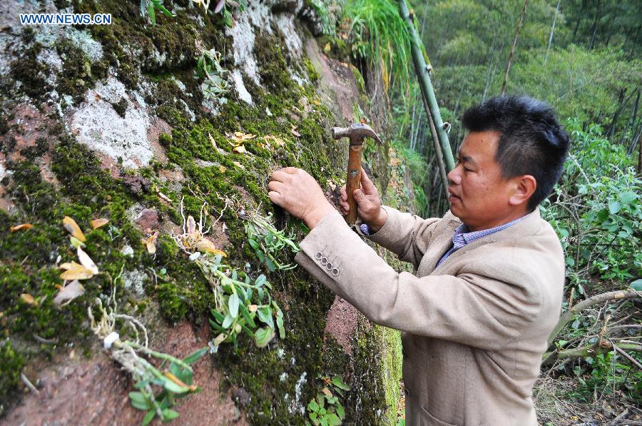 A farmer plants Dendrobium officinale Kimura et Migo, a kind of rare traditional Chinese medicine, in Wang'er Town of Qianshan County, east China's Jiangxi Province, April 22, 2015. Xu Nanjing and his friends, farmers of Wang'er Town, began to plant Dendrobium officinale Kimura et Migo since 2013. The output is estimated to reach about 300 kilograms next year and is expected to yield 1 million RMB yuan (161,300 U.S. dollars). (Xinhua/Ding Minghua)