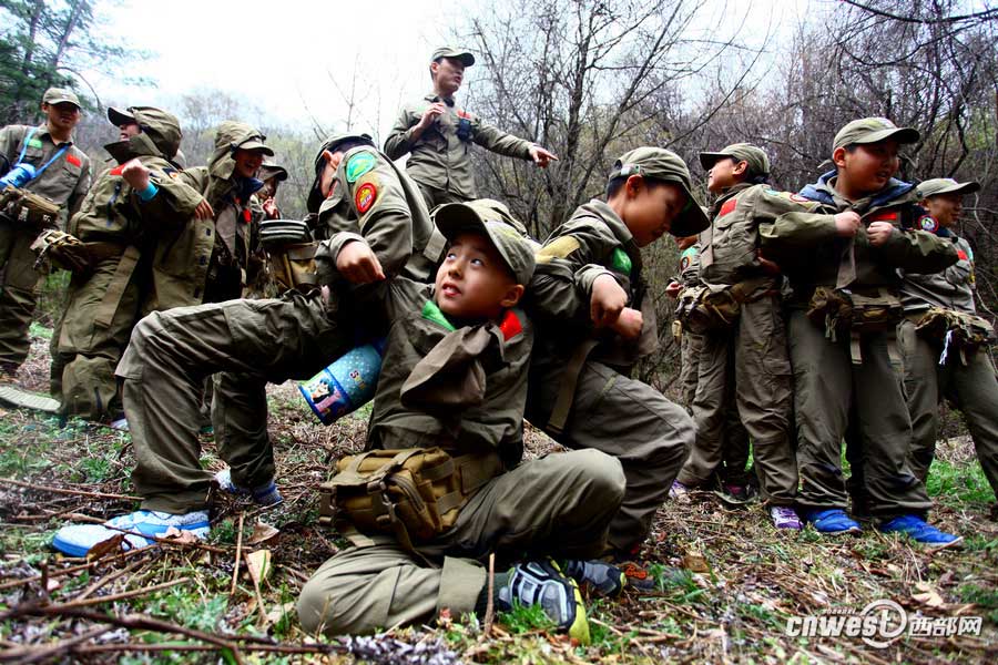 More than 20 primary school students learn outdoor skills including outdoor cooking and experience their lives in the wild in Yingpan Township, Shangluo, northwest China's Shaanxi Province on April 18, 2015. (Photo/cnwest.com)