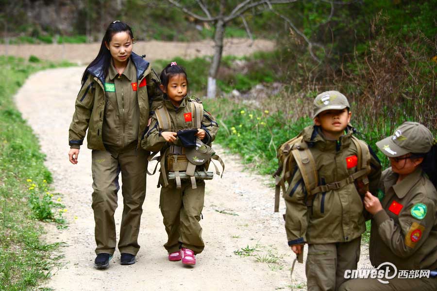 More than 20 primary school students learn outdoor skills including outdoor cooking and experience their lives in the wild in Yingpan Township, Shangluo, northwest China's Shaanxi Province on April 18, 2015. (Photo/cnwest.com)