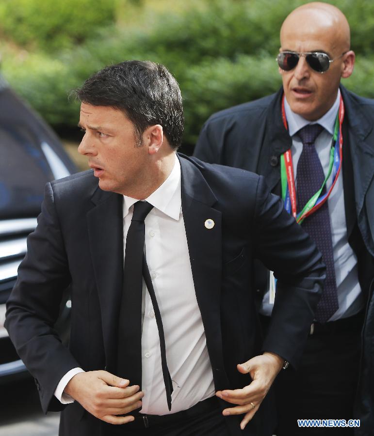 Italy's Prime Minister Matteo Renzi arrives at theEuropean Union(EU) extraordinary summit to discuss how to address the migratory pressures in the Mediterranean at the EU headquarters in Brussels, Belgium, on April 23, 2015. Only 28 migrants out of 700 seem to have survived by far after their boat capsized some 120 miles south of Lampedusa, Italy on Saturday night. (Xinhua/Zhou Lei)