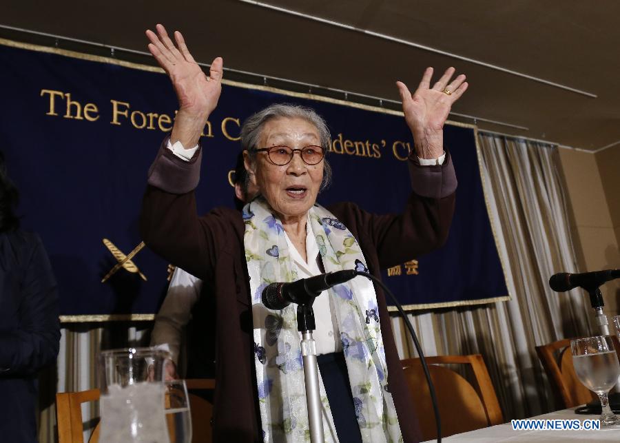 Kim Bok-tong, a former "comfort woman", waves her hands to the press before a press conference in Tokyo, Japan, April 24, 2015. (Xinhua/Stringer)