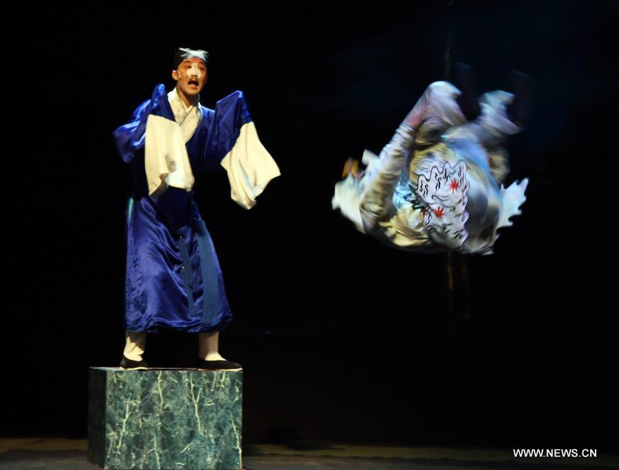 Actors perform during a rehearsal of the Peking Opera "Fantasy of Selling Ghost" at Guoguang Opera Theater in Taipei, southeast China's Taiwan, April 24, 2015. The opera will be on stage on April 25 and 26. (Xinhua/Wu Ching-teng)