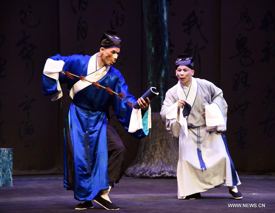 Actors perform during a rehearsal of the Peking Opera "Fantasy of Selling Ghost" at Guoguang Opera Theater in Taipei, southeast China's Taiwan, April 24, 2015. The opera will be on stage on April 25 and 26. (Xinhua/Wu Ching-teng)