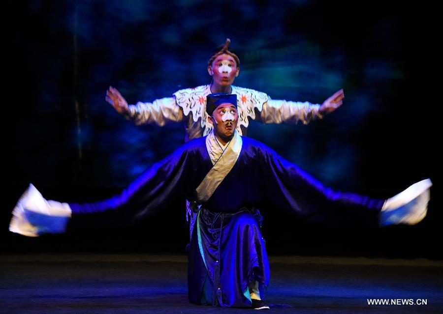 Actors perform during a rehearsal of the Peking Opera "Fantasy of Selling Ghost" at Guoguang Opera Theater in Taipei, southeast China's Taiwan, April 24, 2015. The opera will be on stage on April 25 and 26. (Xinhua/Wu Ching-teng)