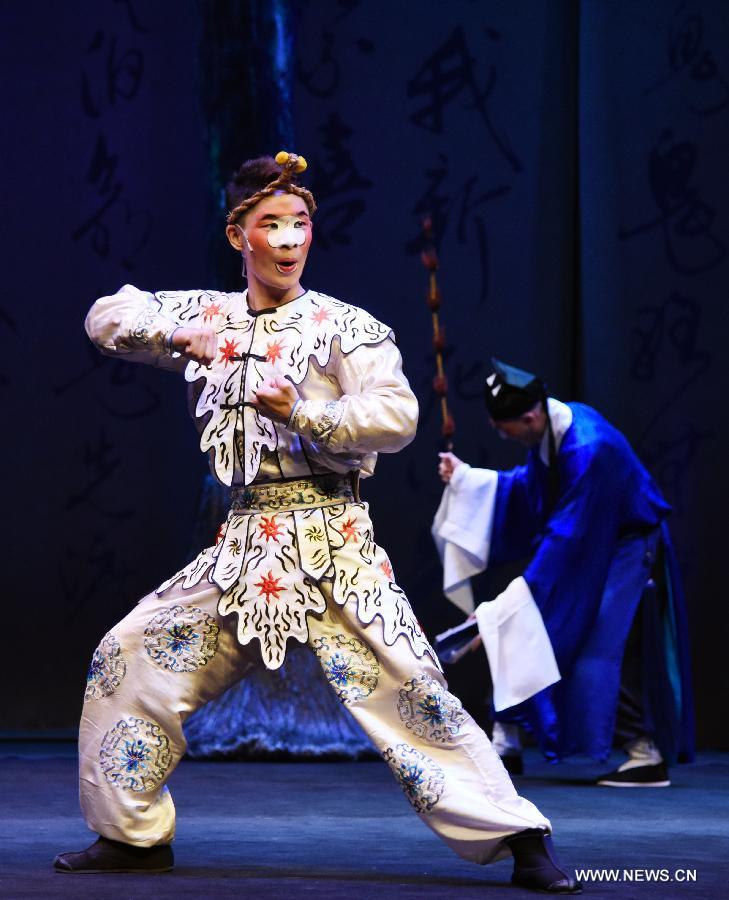 | Actors perform during a rehearsal of the Peking Opera "Fantasy of Selling Ghost" at Guoguang Opera Theater in Taipei, southeast China's Taiwan, April 24, 2015. The opera will be on stage on April 25 and 26. (Xinhua/Wu Ching-teng) |
