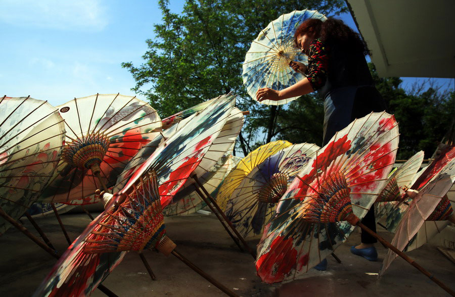 A villager dries the oiled paper umbrellas under the sun. (Xinhua/Liu Xueyi)