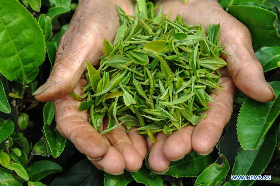A tea farmer shows newly-picked tea leaves in Huishui County of Qiannan Buyi Autonomous Prefecture, southwest China's Guizhou Province, April 25, 2015. Tea farmers here are busy with picking up the last batch of spring tea leaves. (Xinhua/Ou Dongqu)